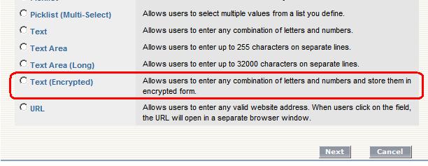 *Search the Salesforce.com Help & Training section, searching for “Encrypted Custom Fields” for more details.